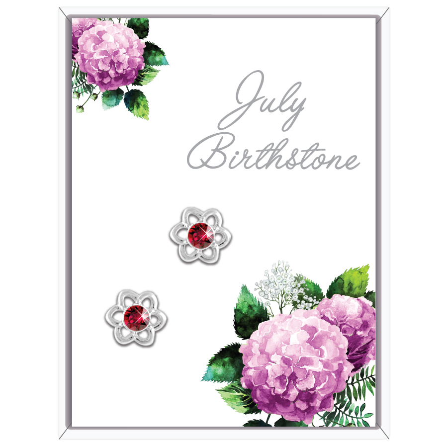 Buy these beautiful, delicate flower shaped earrings for July embellished with a birthstone crystal. In the colour of ruby which is the birthstone for July. These earrings are exquisite and unique and add a bit of sparkle to any outfit at any time of the year. Birthstone earrings are the perfect birthday gift or just a treat for yourself. The wearing of birthstones is thought to bring good luck, good health, and protection. Astrologers long ago attributed supernatural powers to certain gemstones.